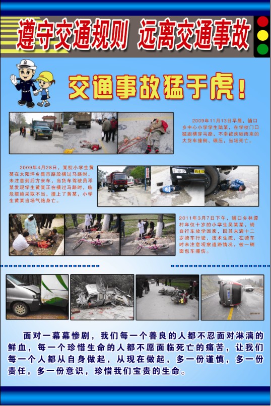 交通事故时时刻刻都会发生,它就像颗威力十足的炸药,一时大意,这颗埋伏在我们生活中的炸药就会爆炸,炸得家庭破碎,炸得人心悲苦。人们说,交通事故猛于虎。可是老虎再凶,也只能一口吃掉一个人,而交通事故则会一口吞噬几个甚至几十个人的生命。道路交通安全事故已成为一个我们不得不正视的突出问题。