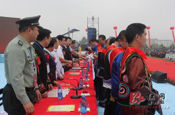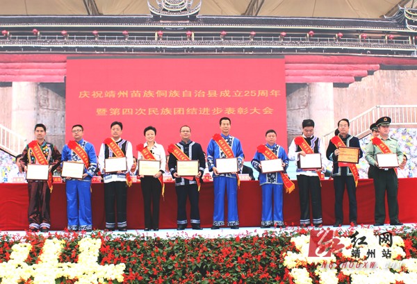 靖州新闻网·红网靖州站讯(分站记者 刘杰华 覃雪莲 肖平 )9月26日,靖州苗族侗族自治县召开第四次民族团结进步表彰大会,对该县近五年来为民族团结进步事业作出突出贡献的模范集体10个和模范个人各10名进行了隆重表彰,模范集体奖金各1万元,模范个人奖金各5000元,总奖金15万元。