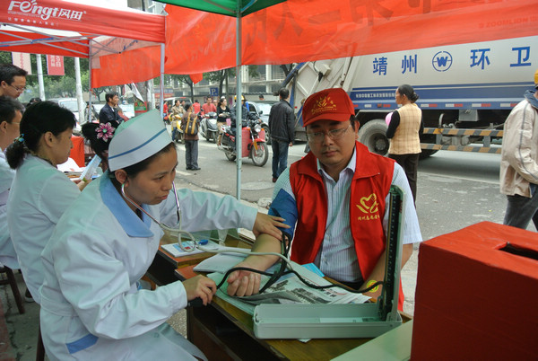 靖州新闻网·红网靖州站讯(分站记者 刘杰华) 9月27日,靖州县人民政府副县长李彬身着志愿者服装在接受“义诊”,他所付给的诊疗费全部投入到旁边的募捐箱作为助学金。当天,在他的亲自参与下,靖州志愿者协会组织“助学贫困 爱心义卖”活动,募得助学金21649.9元。
