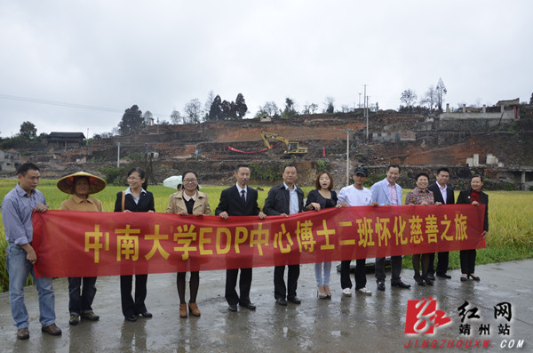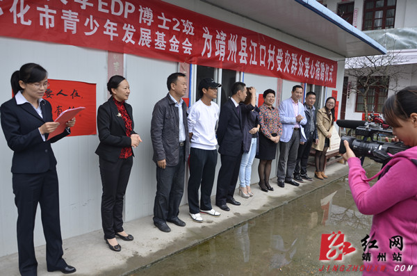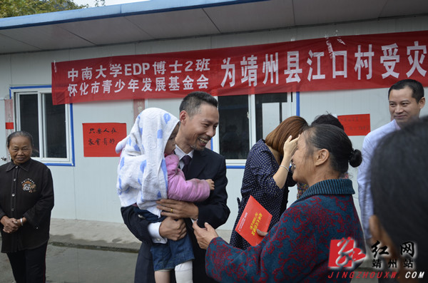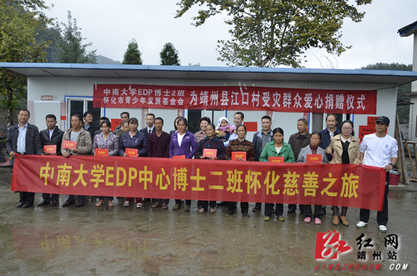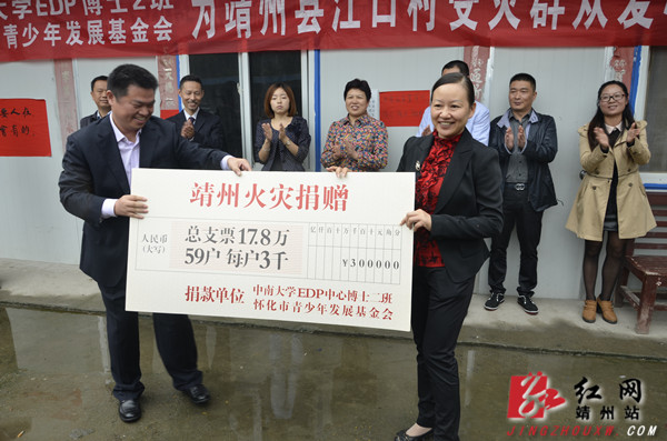 靖州新闻网·红网靖州站9月5日讯(记者 陈俊名) 9月5日,中南大学EDP博士2班的企业家学员代表一行在共青团怀化市委书记杨健桃和靖州县委常委、宣传部长戈承艳陪同下,来到“8·5”寨牙江口火灾临时安置点,将17万8千元爱心捐款送到受灾村民手中。