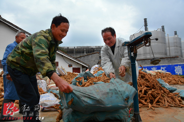 靖州新闻网·红网靖州站3月19日讯(记者 刘杰华)“一块五一斤,不论大小,15万斤全部送完了!”3月19日,靖州苗族侗族自治县湘佰仕酒业公司的厂房门前,葛农和工人高高兴兴地将收挖来的葛根过秤称重,地上摆满了收购来的葛根。
