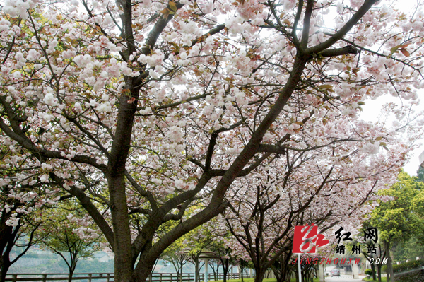 靖州新闻网·红网靖州站讯(通讯员 马良文)4月2日下午,春风习习,笔者慕名来到水酿塘电站花木园,欣赏了美丽的樱花。大片的樱花让人陶醉。清纯而不娇艳的樱花,一束束,一球球,一眼望去,就好像是湛蓝的海洋上浮起的一朵朵淡红色的云,又好像是一条微红色的飘带把葱茏的泡里山缠住。樱花树枝上除了花,偶尔露出了几片淡绿色的叶,真是点缀得可爱!