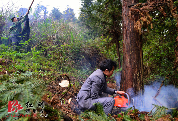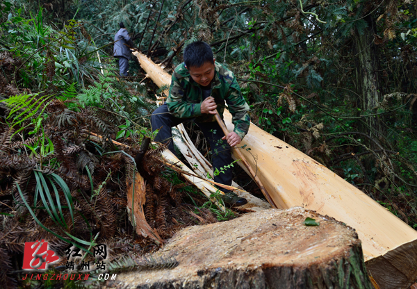 采伐工人制作伐木拉钩控制倒树方向 龙本亮 摄影