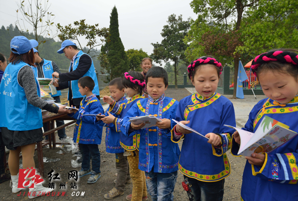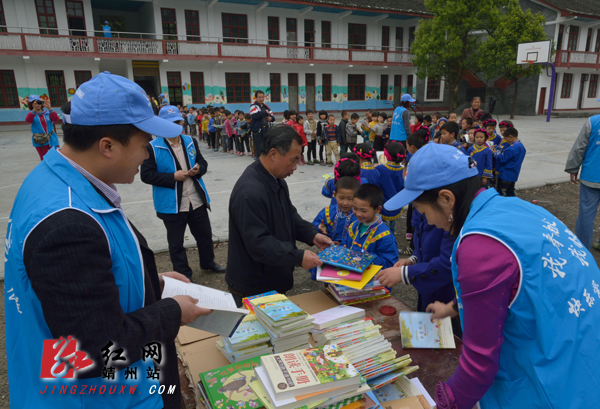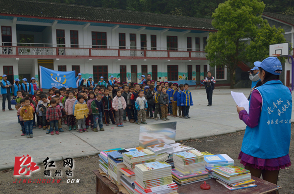 靖州新闻网·红网靖州站4月14日讯(龙本亮 唐涛) 4月14日,靖州快乐爱心公益协会的义工们将海外中国教育基金赠送给大堡子岩湾小学的图书送到学校,在进行简短的赠送仪式后,义工们与学校老师一起,将拆封盖章,再由学生传递到学校图书室。