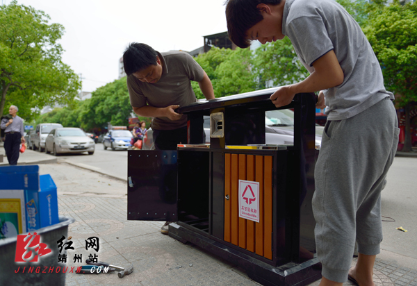 靖州新闻网•红网靖州站4月16日讯(龙本亮 吴世武)4月16日,靖州城管局工作人员在新建路安装分类垃圾箱。今年,靖州苗族侗族自治县实施巩固国家卫生县城,创建省级文明县城、省级园林县城“一巩固两创建”发展战略,大力投入城市环境及基础设施配套资金,加大环境保护力度,提升城市品位,700个分类垃圾箱将在城区主街道、公园将陆续安装到位。