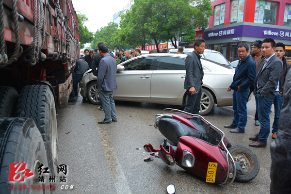 靖州新闻网·红网靖州站4月23日讯(刘杰华) 4月23日早上8点左右,靖州苗族侗族自治县渠阳中路发生一起车祸。一辆浅槟色的凯迪拉克轿车从巷道驶出的时候突然加速失控,撞倒一辆正在行驶的电动车和一辆摩托车后,又迎头撞上一辆正在卸货的大货车的邮箱和轮胎位置停下。当时正值上班高峰期,人行道上行人密集,因为大货车的遮挡,众多行人幸免于难。接警后,靖州交警迅速出动,勘察、处理事故,车祸造成至少3人受伤,已送往医院救治。民警提醒:雨天路滑,谨慎驾驶,注意避让。