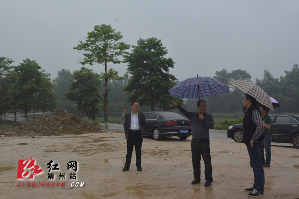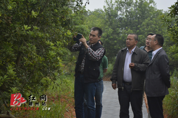 察看靖州杨梅台主会场建设,副县长粟东来陪同。 覃雪莲 摄
