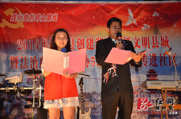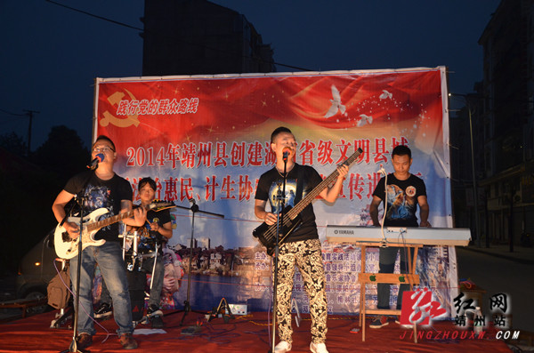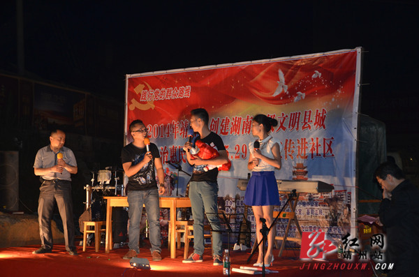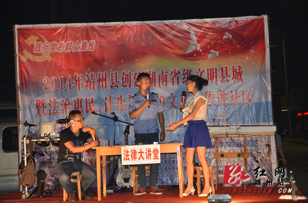靖州新闻网·红网靖州站6月10日讯 ( 分站记者 陈俊名 通讯员 颜丫丫)6月9日,2014年靖州县创建湖南省级文明县城暨法治惠民、计生协5.29文艺宣传进社区活动走进土桥社区,通过歌曲、朗诵、舞蹈、小品、派发宣传单、有奖竞猜等多种形式向社区居民宣传创省级文明县城、法治惠民、计生方面的知识,群众积极参与,并得到了群众的一致好评,在了解相关政策的同时也丰富了群众的业余生活。