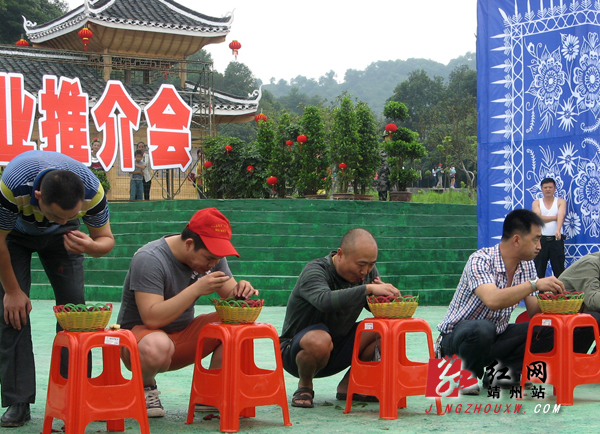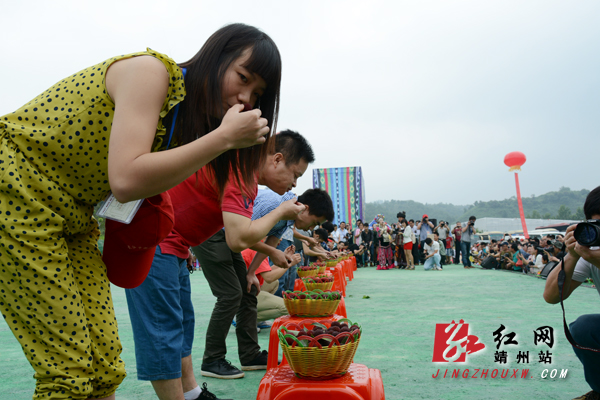 随着主持人一声令下,比赛选手完全顾不了形象,手不停地抓杨梅,两颗、三颗的往嘴里塞。