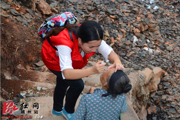 细心的志愿者为一个伤心流泪的婆婆滴眼药水 通讯员 摄