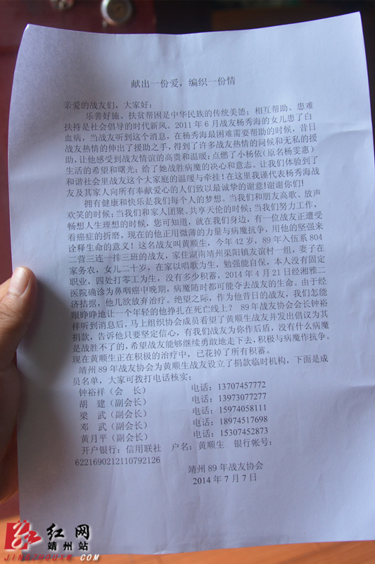 为了汇聚更多的爱心,更好地帮助黄顺生,靖州89战友协会还为黄顺生设立了临时捐款机构,公布了成员名单和电话(会长,钟裕祥,13707457772),以及黄顺生的银行账号: