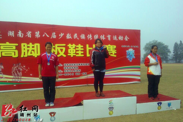 高脚运动员杨芳(左)在领奖台上 通讯员 摄