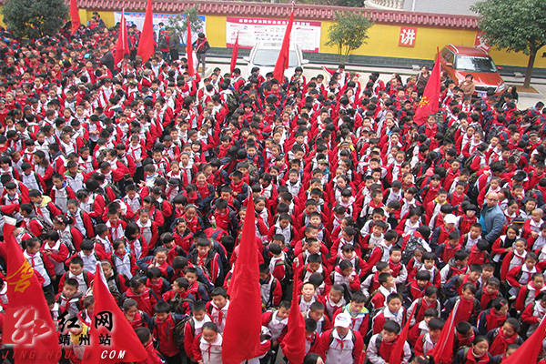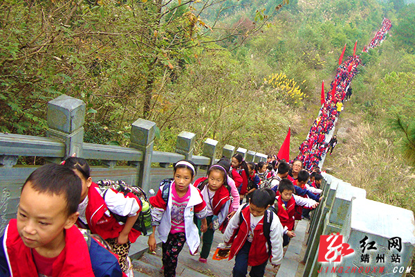 “行军”前,全体师生进行了誓师动员大会。操场上红旗招展,孩子们精神抖擞、信心百倍,宣誓声铿锵有力、整齐划一,响彻校园。上午8点半,在火红的队旗引领下,浩浩荡荡的学生队伍从学校出发。途中各班高唱《学习雷锋好榜样》、《团结就是力量》、《爱我中华》等红歌,嘹亮的歌声此起彼伏,吸引无数市民侧目观望。徒步行至飞山公园寨门广场后,沿着石阶路开始登山,每位同学激情澎湃,斗志昂扬,呼吸着清新的空气,一边高唱加油鼓劲的革命红歌一边欣赏和领略大自然的风光,丝毫不觉得远足的劳累。登至白云洞后沿环山马路返回寨门广场休整,各年级分别进行游戏活动。下午举行登山比赛后,孩子们把活动场所的垃圾捡拾干净,全体整队进行了拉歌活动。2点半,全体队伍开始沿原路返回学校,最终没有一个学生掉队,全部安全回到了学校。