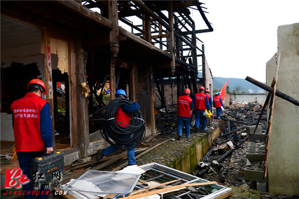 铺口乡林源村自1月25日发生火灾以来,受灾群众正常用电问题就一直牵动着靖州县电力公司全体员工的心,火灾发生当天,电力公司便连夜组织人员安装好了临时电缆,帮助受灾群众度过了一个明亮的春节。近两个月的时间过去,用安全电缆替换临时电缆的事宜,让受灾群众用上放心电安全电,又提上了靖州县电力公司的工作议程。恰逢3月“学雷锋月”,靖州县电力公司雷锋电力服务队便将学雷锋第一站设立在了林源村,服务队员们身上鲜红的马甲,为灾后的林源增添了一抹重建的激情。