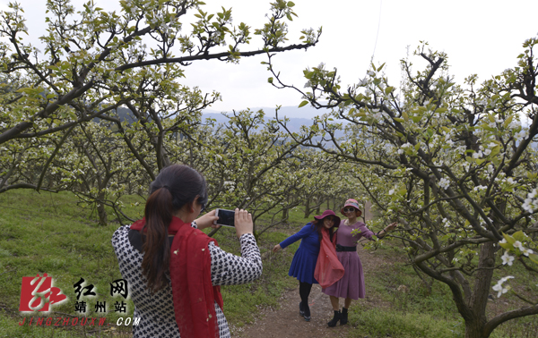 游人在梨园里拍照 龙本亮 摄