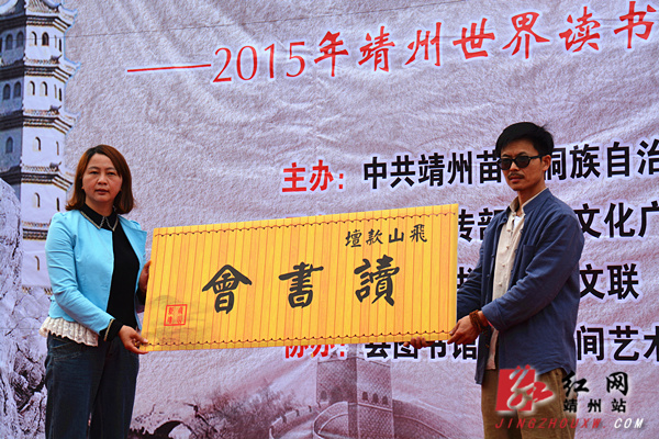 副县长邓利芳为“飞山款坛读书会”成立授牌,县领导杨秀芳、龙宪周、邓利芳、陈建平为读书会赠书。
