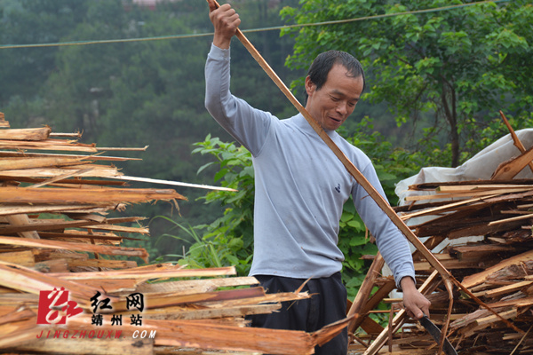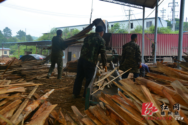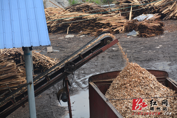 靖州新闻网·红网靖州站5月25日讯(记者 陈俊名 通讯员 吴世武)5月25日上午,记者来到靖州江东管委会团结村梨子园废旧杉木削片加工厂,只见厂内机器轰鸣、削片飞舞,工人们有的在铲除杉木皮,有的在给木片打梱,干得热火朝天。