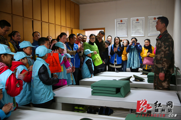 小朋友们首先来到消防战士宿舍,现场给小朋友们进行内务表演。看到消防官兵短短几分钟就将皱褶的被子叠成了一个“豆腐块”,小朋友们都惊讶地张大了嘴巴。