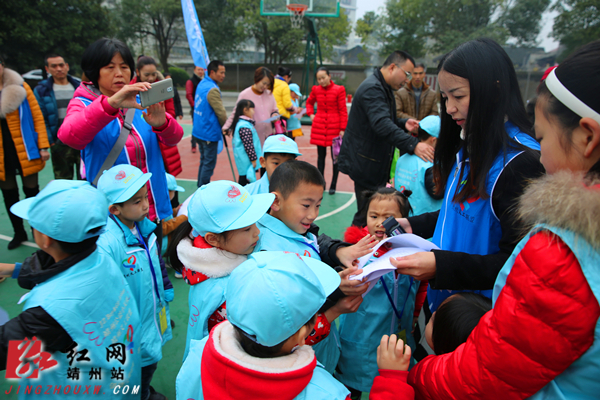 义工给孩子们发放消防儿歌宣传单。 刘杰华 摄