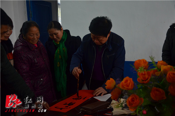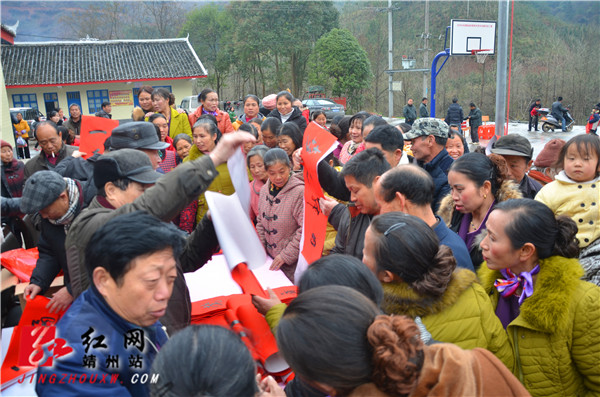 靖州新闻网·红网靖州站1月28日讯(分站记者 龙沛)1月28日,靖州老年大学老干部(老年)书画协会到横江桥沙堆村开展送春联下乡活动,现场书写和发放春联1000余幅,获得当地群众一致好评。