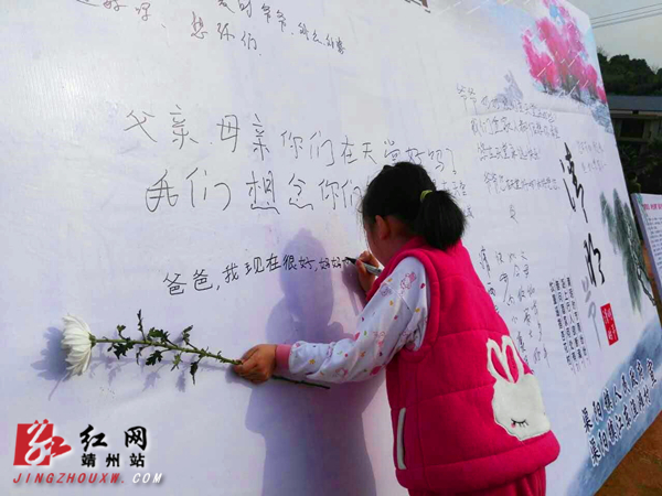 靖州新闻网·红网靖州站4月4日讯(记者 刘杰华 通讯员 颜丫丫)“爷爷、奶奶,你们在天堂还好吗,我们都很想念你们!”4月4日,在靖州苗族侗族自治县渠阳镇渔滩村进山路口设立的“文明祭祖宣传站”,许多扫墓的市民听了志愿者的宣讲后,放下了手中的鞭炮、烧纸,从志愿者手中换回了鲜花和松柏,并在“哀思牌”上缅怀逝去的亲人。