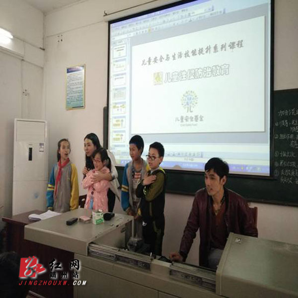 4月13日下午,来自靖州县志愿者协会的志愿者们来到飞山小学,给学校五年级的学生上了一堂生动有趣的防性侵教育课。