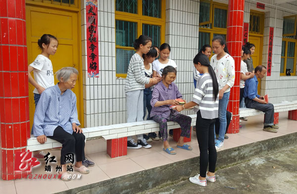 横江桥老人公寓位于横江桥爱国村朱丝坡,距离集镇3公里,共有8名孤寡老人和1名管理员。6月9日是端午节,横江桥中学的志愿者们6月8日提前与孤寡老人们共度端午节,她们用在学校捡拾垃圾、公益劳动获得的资金,给老人们买了粽子、白糖以及西瓜、香蕉等水果。她们三人或五人一组关心慰问一位老人,陪老人们聊天、说笑、唠家常,为老人剪指甲、敲背、切西瓜。