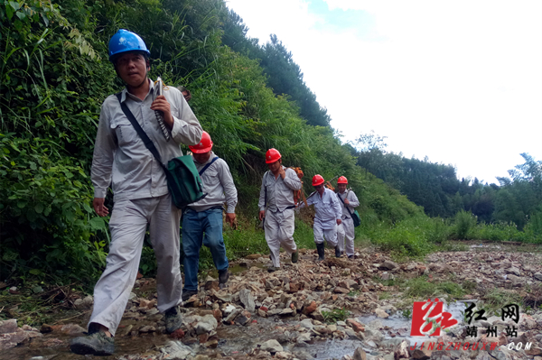 洪水冲毁了道路,电力工人步行进村。 刘杰华 摄