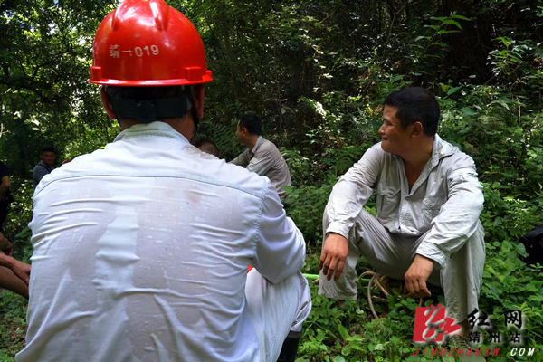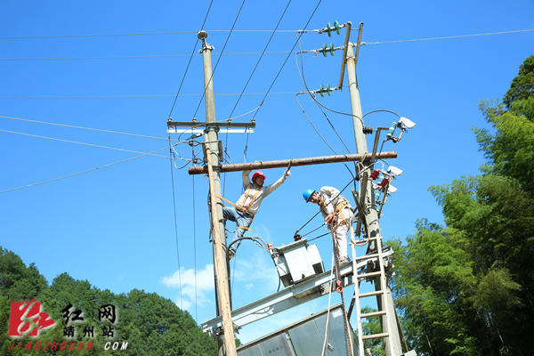 头顶烈日,电力工人着装整齐在抢修电力设施。 刘杰华 摄