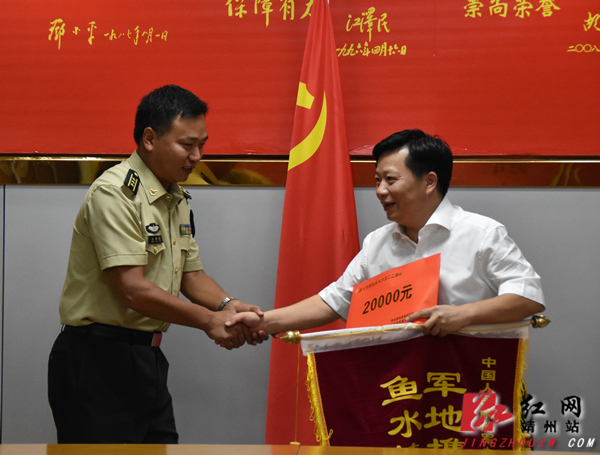 田连钊将锦旗和慰问金送到部队首长手中。 何嫘/摄