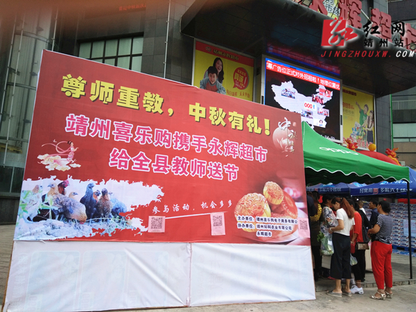 靖州新闻网·红网靖州站9月11日讯(分站记者 何嫘)9月10日,是一年一度的教师节。当天,靖州300余名教师凭教师资格证免费领到了大月饼。据了解,为感谢教师、回馈社会,爱心商家靖州喜乐购电子商务公司在永辉超市门前举办了此次活动。同时,公司在玉麟庵市场设置了活动分会场,通过抽奖形式面向教师免费赠送土鸡。