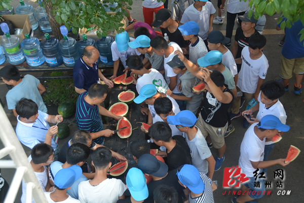 靖州新闻网·红网靖州站讯(记者 陈俊名)8月2日上午,在靖州一中新老校区县庆演出排练现场,靖州县总工会“送清凉”活动慰问小组亲切慰问奋战在一线的演员们,给他们送去了2300余条毛巾、5000斤西瓜。