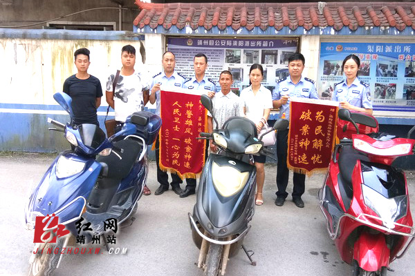 靖州新闻网•红网靖州站(通讯员 陈维松 潘丽娜) 8月7日上午,在渠阳派出所举行的系列盗窃案退赃仪式上,看到失而复得的电动车,失主武女士很激动地握着民警的手说“没想到被偷的电动车这么快就被找回来,真是太感谢你们了”,并会同失主蔡先生将“破案神速,为民解忧”和“人民卫士一心为民,神警雄风破案神速”的两面锦旗送到民警手中表示感谢。