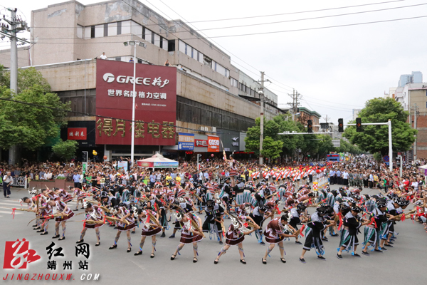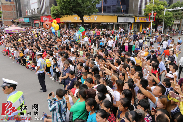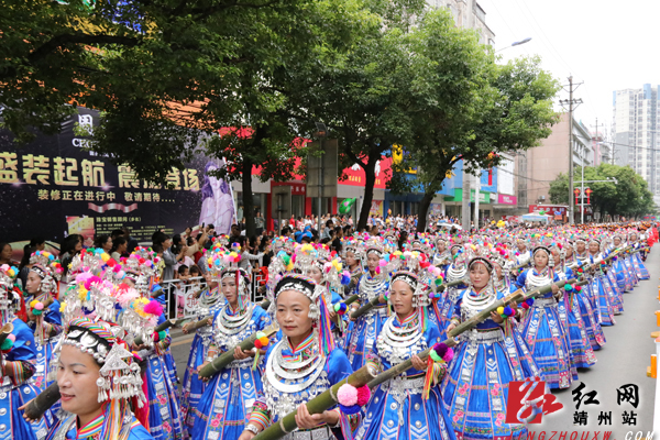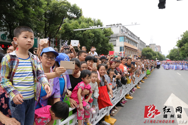沿途,文化表演队伍经过之处,只见马路两边人山人海,每当队伍和市民群众打招呼时,顿时人群中一片雀跃。而文化表演方阵的在四鼓楼的精表演更让期待已久的广大市民群众发出赞叹,人群中只见无数手机在拍摄和记录着这值得纪念的一刻。其中来自三锹乡身着盛装的苗族歌鼟方阵最为抢眼,精美的服饰和整齐一致的队形,让人过目难忘。而花车则直观的介绍了靖州30年来的成果和改变。