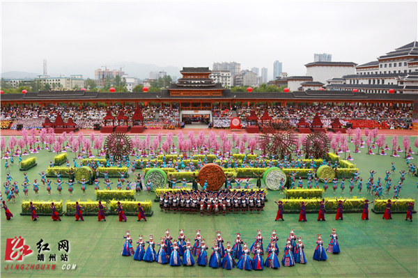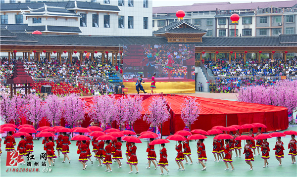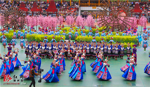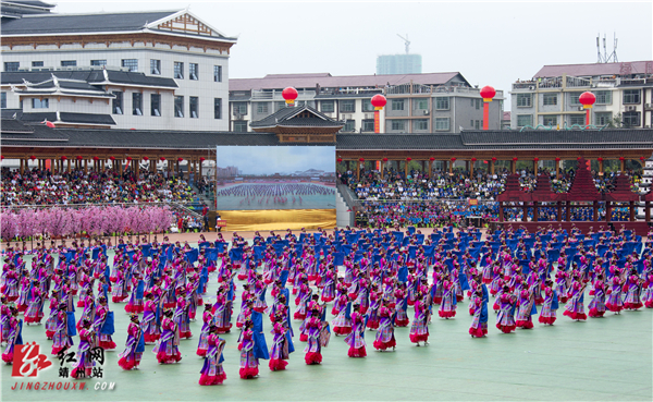 演出现场,一个个富有民族韵味的节目,形象表达了靖州人民热爱家乡、热爱祖国的真挚情感,生动反映了各民族共同团结奋斗、共同繁荣发展的喜人景象。现场歌声与欢笑汇成海洋,赞美与祝福凝成乐章,苗乡侗寨阿哥阿妹们的精彩演出赢得了现场观众的阵阵掌声和热情赞誉。
