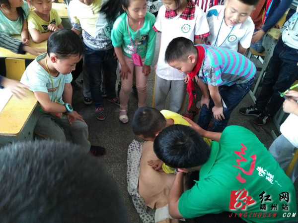 来自怀化市第二人民医院靖州医院医保办的心唤醒志愿者沈河钦用通俗易懂的语言向老师和学生们介绍了“心肺复苏”“人工呼吸”等常用急救知识,用模型实际演示了“心肺复苏”和“人工呼吸”两种急救方式,并让师生们进行亲身体验。