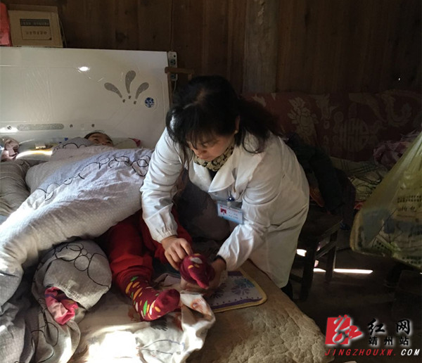 检查完后,医生为瘫痪在床的困难妇女穿好袜子。