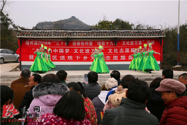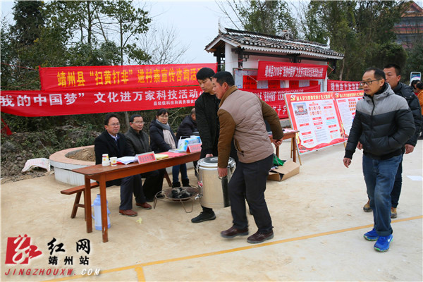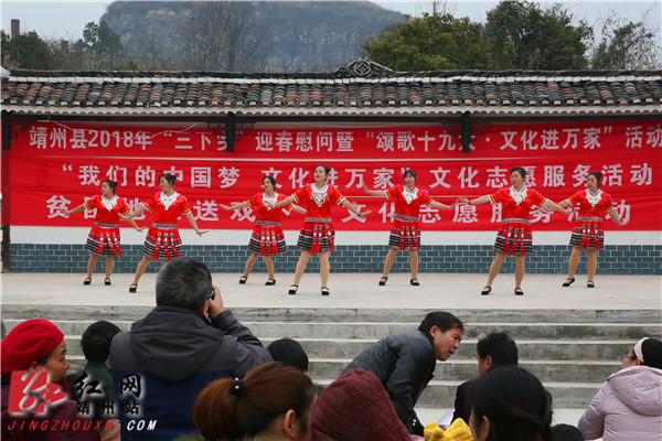 靖州新闻网·红网靖州站2月7日讯(分站记者 易子明 通讯员 杨亚妮)2月7日,不一样的天气, 不一样的场地,靖州县2018年文化科技卫生“三下乡”活动的各工作服务队的工作人员带着同样的真情,走进了渠阳镇黎明村,为广大群众送知识、送健康、送演出……送去新春祝福和欢乐,倾心倾力地演出和服务,受到了当地村民的热情欢迎和称赞。