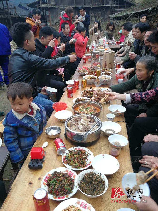 靖州新闻网·红网靖州站2月16日讯(通讯员 王纯一)2月15日,大年三十,外出务工的年轻人大多都回来了,靖州县大堡子镇三江村踏鼟坡寨子的村民把年夜饭摆成长桌宴,分享幸福和喜悦。