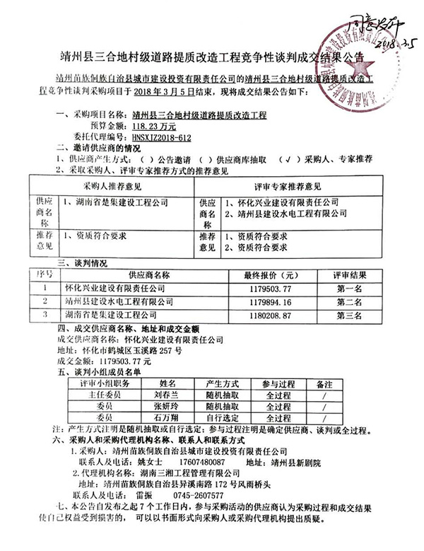 靖州县三合地村级道路提质改造工程竞争性谈判成交结果公告