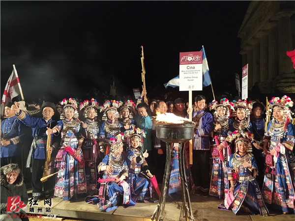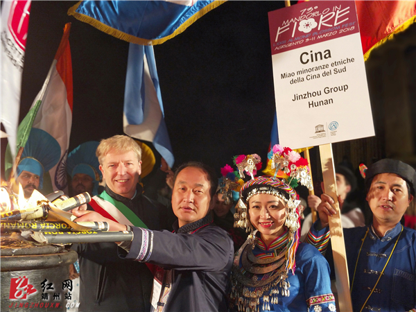 靖州新闻网·红网靖州站3月7日讯(张景武 王纯一 何嫘)罗马时间3月6日,意大利第73届杏花节世界非遗展演展示活动在阿格里真托市神殿之谷考古与参观公园开幕。中国靖州苗族歌鼟代表团登台,齐声用中国语言向世界说"你好"。活动主办方邀请中国湖南省靖州苗族侗族自治县苗族歌鼟代表团团长林华共同点燃火炬。