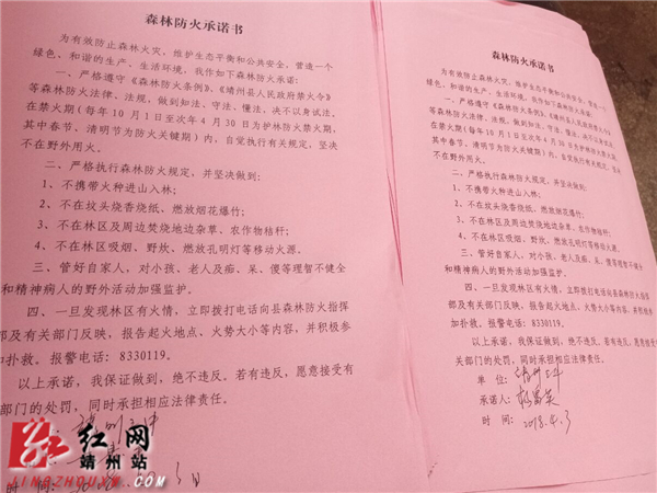 靖州新闻网·红网靖州站4月4日讯(通讯员 马良文 伍定军)“为有效防止森林火灾,维护生态平衡和公共安全,营造一个绿色、和谐的生产、生活环境,我作出如下森林防火承诺:一、严格遵守《森林防火条例》、《靖州县人民政府禁火令》等森林防火法律、法规,做到知法、守法、懂法,决不以身试法,在禁火期(每年10月1日至次年4月30日为护林防火禁火期,其中春节、清明节为防火关键期)内,自觉执行有关规定,坚决不在野外用火。……以上承诺,我保证做到,绝不违反。若有违反,愿意接受有关部门的处罚,同时承担相应法律责任。”4月3日,靖州三中教师吴海辉在认真阅读、领会《森林防火承诺书》内容后,在承诺人后面郑重地签上了自己的名字。