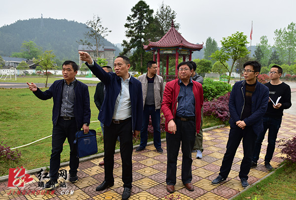 县教育局党委书记、、局长侯平拥(左二)在藕团中学查看楼顶水塔位置 龙本亮 摄