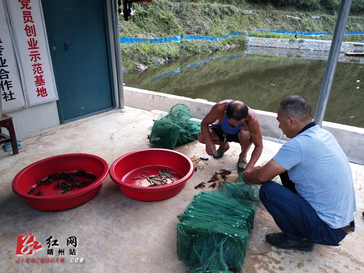 扶贫工作队驻村后,经过多方考察,认为该村清水湾水塘水质良好,位置优越,利用清水湾开发水产养殖是一条好门路。找到了发展“良方”,工作队与村支两委立马行动,将村民组织起来采取合作社+村集体经济+贫困户模式成立专业合作社,为贫困户增加收入的同时可以发展村集体经济。合作社与村集体、贫困户签订分红协议,每年拿出不低于2万元给贫困户分红,同时积极鼓励村民入股,使贫困户、村干部全部入股成为股东。村民共同管理经营,投工投劳喂养鱼虾、捕虾、出售。目前,该基地运营良好,主要养殖龙虾、鱼等水产品,已经投放龙虾2万尾,鱼苗1万尾,昔日闲置的清水湾如今鱼虾欢腾,成了村里的“金水湾”。