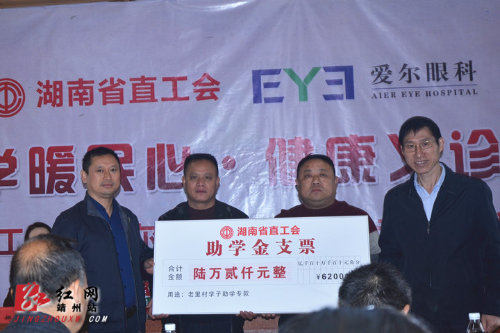 靖州新闻网·红网靖州站10月17日讯(分站记者 周悦伊)10月16日,在靖州藕团乡老里村“金秋助学暖民心,医疗义诊送光明”湖南省直工会与长沙爱尔眼科医院助推老里村脱贫攻坚活动的捐助仪式上,村支部书记从湖南省直工委副书记、省直工委主席谢立三,和省直单位困难职工帮扶中心主任李继文手里接过6.2万元助学金支票,激动地不停道谢。