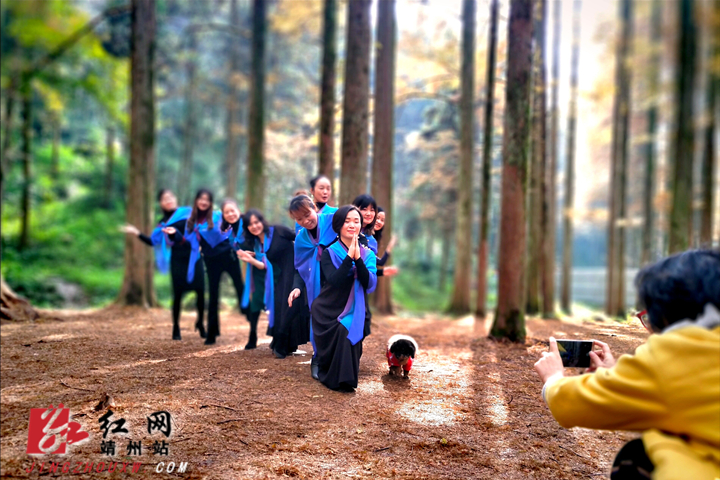 靖州新闻网·红网靖州站11月25日讯(分站记者 刘杰华) 11月25日,排牙山国家森林公园,游客在水杉林中拍照游玩。
