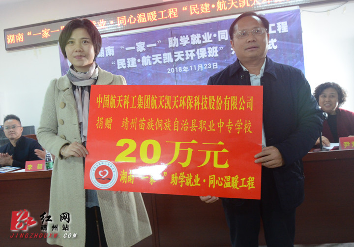 据悉,湖南“一家一”助学就业·同心温暖工程,由湖南省委统战部、省教育厅、省扶贫办牵头,湖南中华职业教育社和民主党派省委组织实施,以我省贫困家庭贫困学生为项目实施对象、以优质职业院校为项目实施学校、以社会各界爱心企业人士为项目公益伙伴。此次靖州贫困学子的助学金由中国航天科工集团航天凯天环保科技股份有限公司捐赠,资助50名贫困学子每人4000元生活费,通过两年的在校学习、一年顶岗实习、推荐就业,进而实现贫困家庭脱贫。