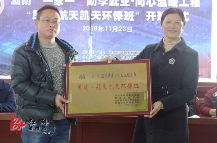 开班仪式上,民建湖南省委副主委、湖南省科技厅副厅长朱皖为中国航天科工集团航天凯天环保科技股份有限公司授“公益伙伴”匾牌,湖南省温暖工程基金会理事长、湖南中华职业教育社社会服务部部长谭圣林代表“一家一”项目办公室为靖州职业中专学校授“实施学校”匾牌,民建怀化市委主委、怀化市人大民族侨务外事委员会副主任肖莉杏为“民建·航天凯天环保班”授班牌。