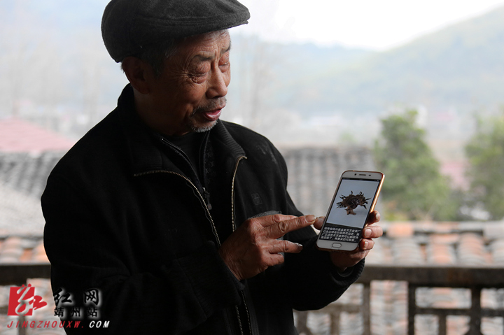 李昌发老人通过手机上网售卖灵芝。 刘杰华 摄