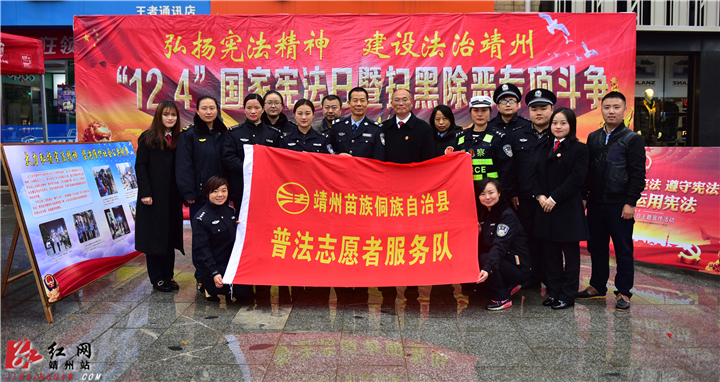 靖州新闻网·红网靖州站12月4日讯(通讯员 姚春玲 向芳)12月4日,靖州县委法治办、县委政法委、司法局、公安局、检察院、法院、森林公安、交警大队,城管局等多家单位,联合在靖州县靖天国际商业步行街举行国家宪法日暨扫黑除恶专项斗争主题宣传活动。